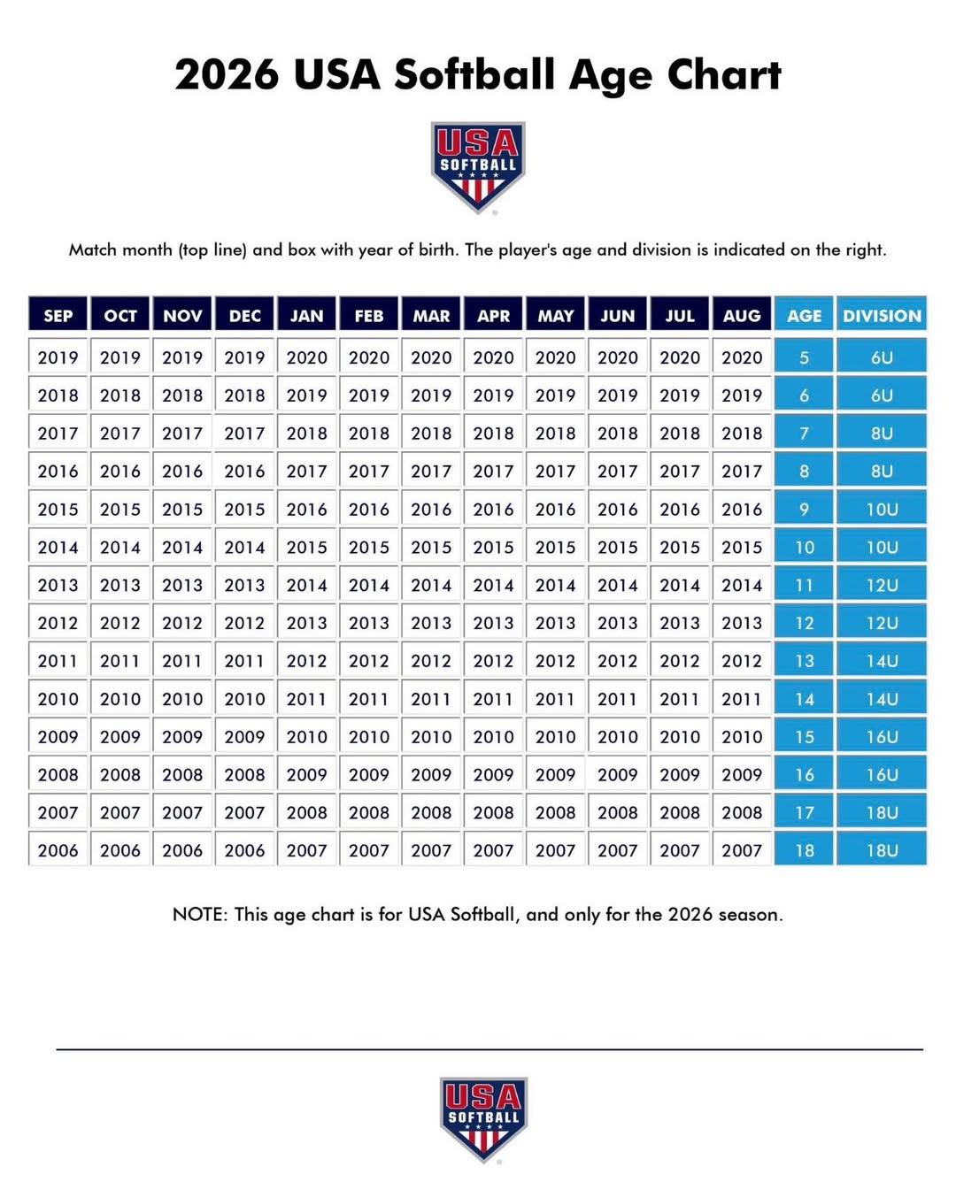 2026 USA SOFTBALL AGE CHART